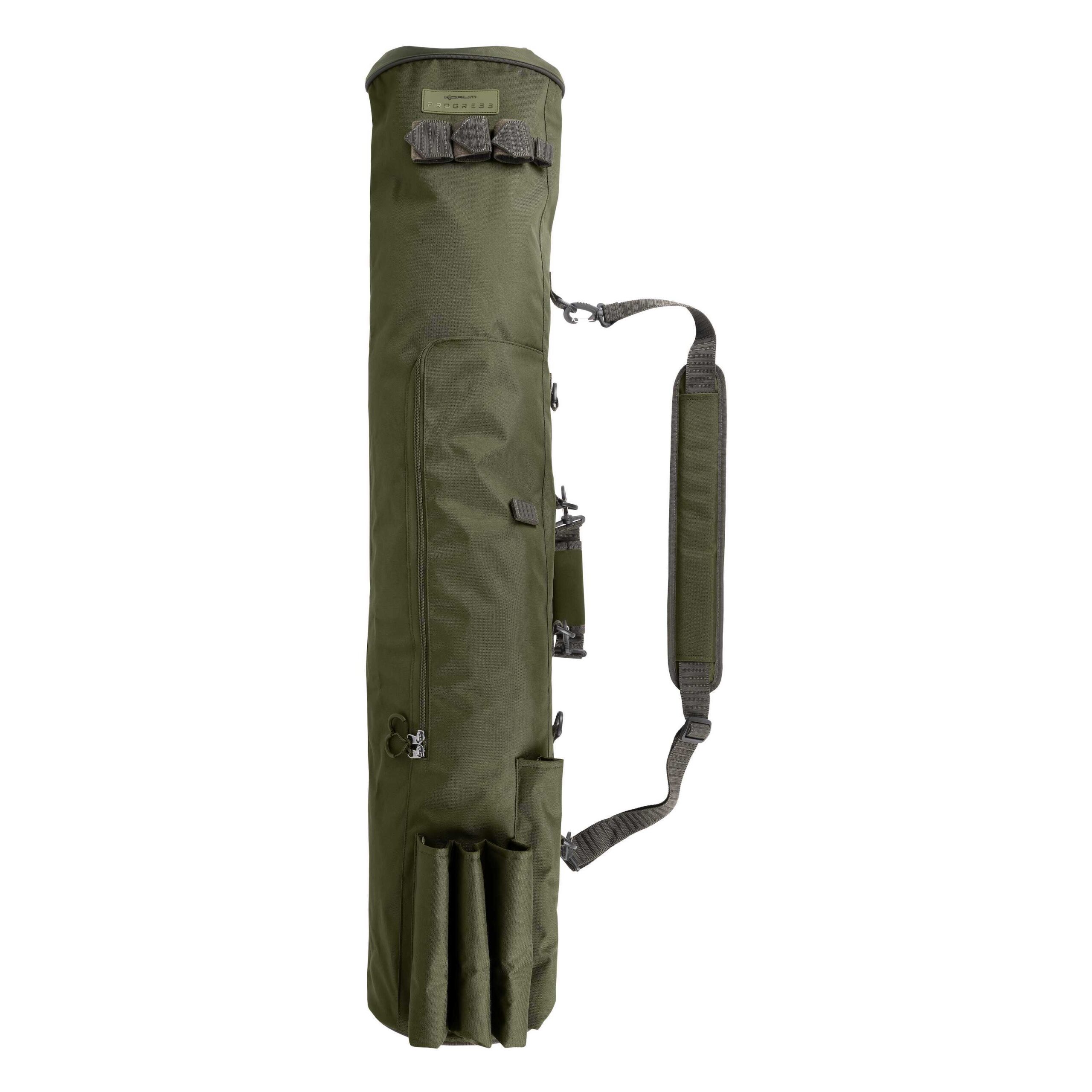 Ospita comodamente tre canne con capienza interna sufficiente per ombrelli e ricoveri notturni. Adattato per fornire un’area su misura per il manico del guadino. Dispone di semplici tasche esterne per il tuo bankware e gli accessori della sedia. Lo scomparto principale è dotato di una funzione roll-top sigillabile. Tracolla imbottita removibile e regolabile per un trasporto confortevole. 23×23×150