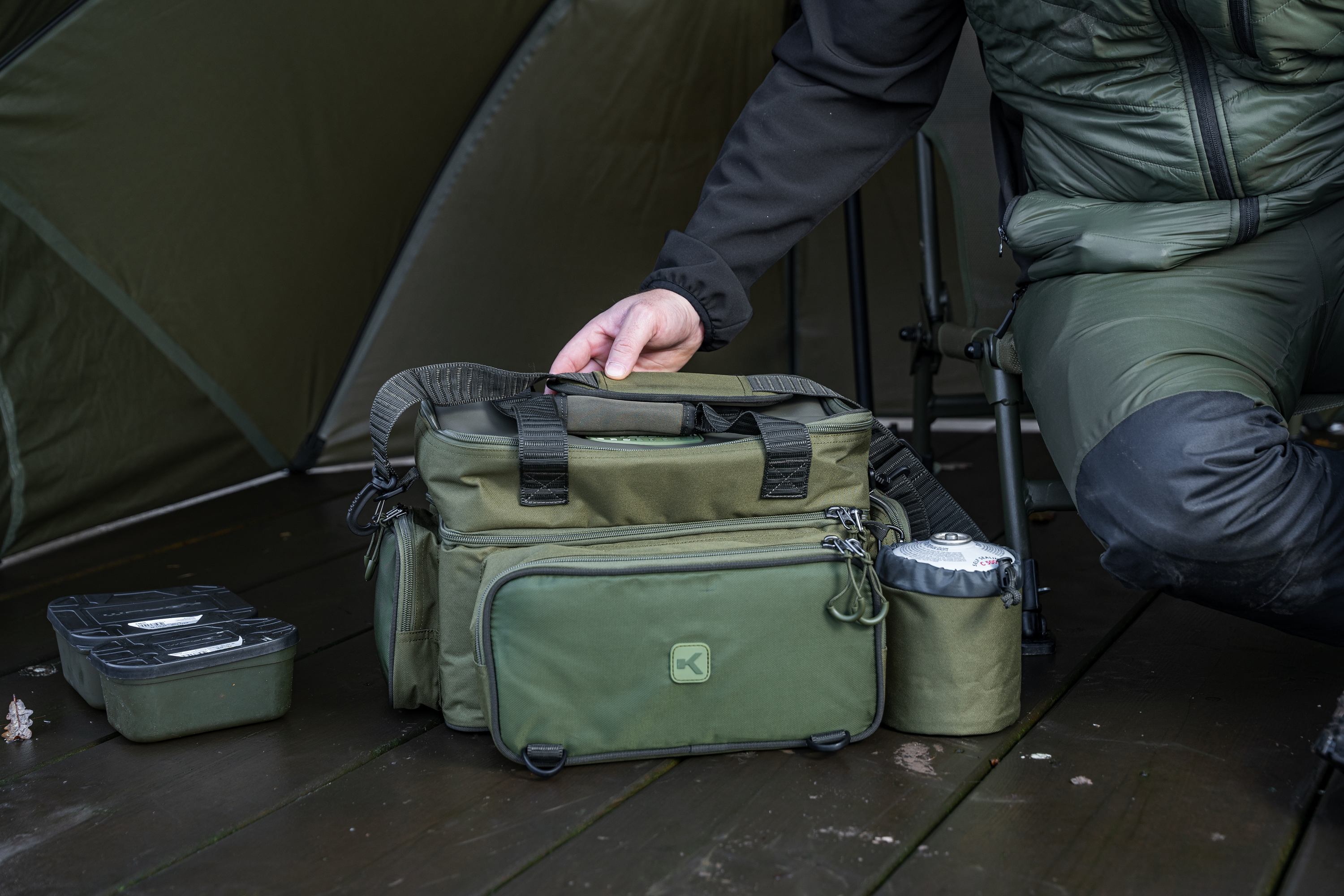 Un modo compatto per portare con sé tutte le esche e il cibo, mantenendoli freschi in modo altamente funzionale. Lo scomparto principale è diviso in due livelli per mantenere il cibo separato dalle esche secondo necessità. Dispone di tre tasche esterne per altri oggetti essenziali o attrezzatura. Tasca frontale compatibile con Roving Blox. Dispone di tracolla imbottita rimovibile, maniglie per il trasporto e fondina per bombola di gas. 41×34×28