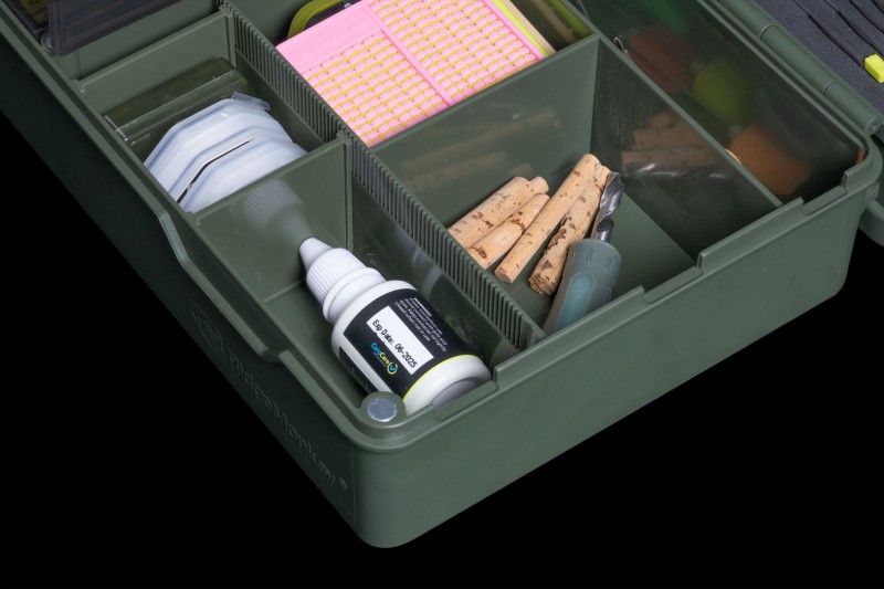 Ci sono un totale di 67 scomparti di varie dimensioni che ospiteranno una vasta gamma di articoli come: forbici, ganci, terminali, multiutensili e aghi; fino ad articoli più piccoli come: perline per ami, girelle e anellini per rig.